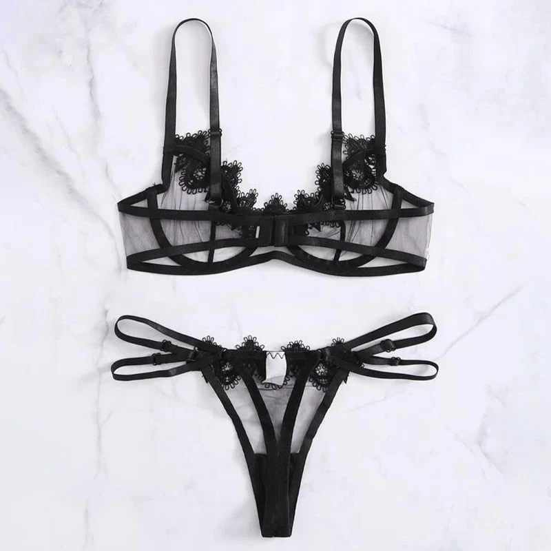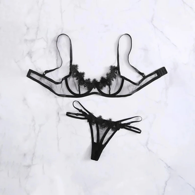 Conjunto de 2 piezas de encaje de retales de malla, ropa interior interesante para mujer, conjunto de lencería Sexy, ropa interior transparente de encaje de Color sólido