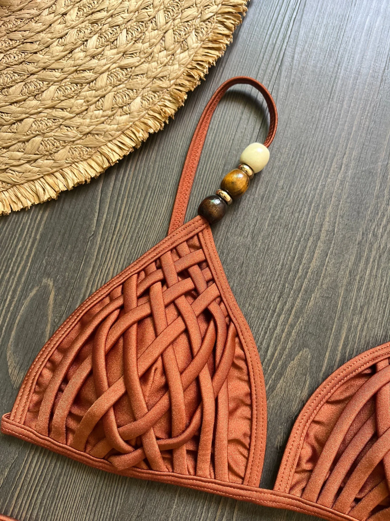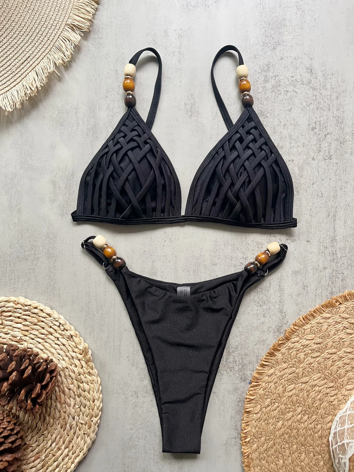 & Free ShippingCompra Conjunto de Bikini marrón Sexy para mujer, traje de baño brasileño con tirantes de perlas, sujetador de realce con agujeros, Tanga, traje de baño para playa 2026