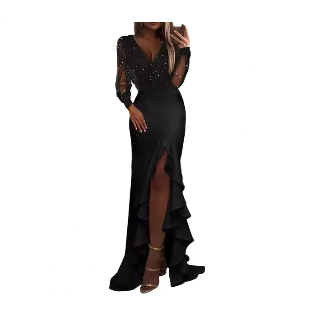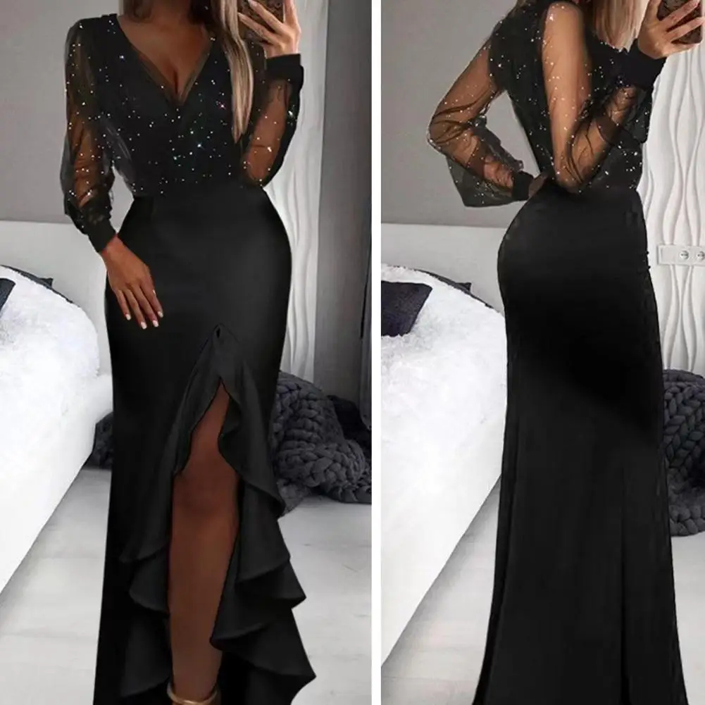 Falda larga con cuello en V para mujer, vestido largo ajustado con lentejuelas elegantes y detalles de malla, fiesta de cóctel de manga larga transparente con purpurina para mujer