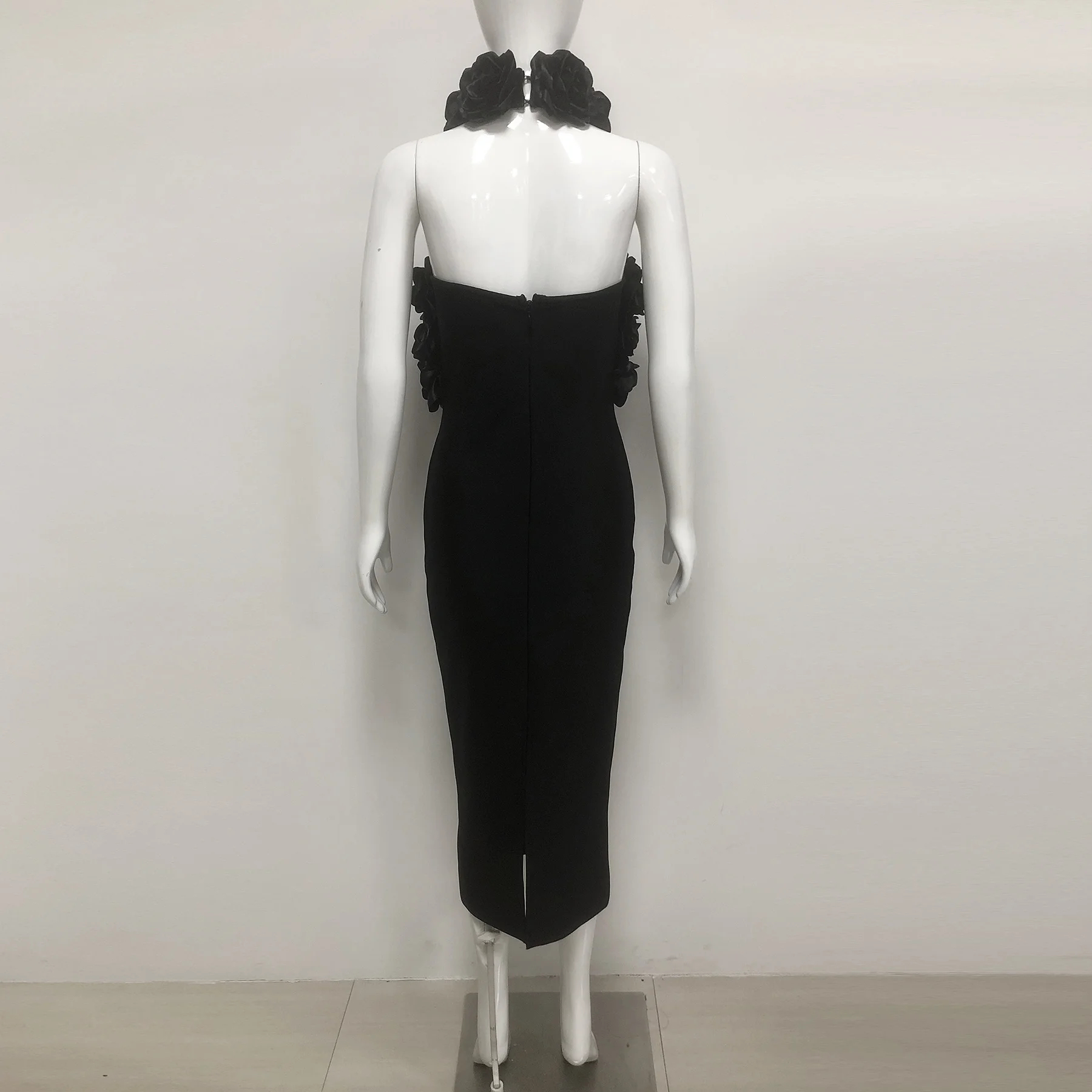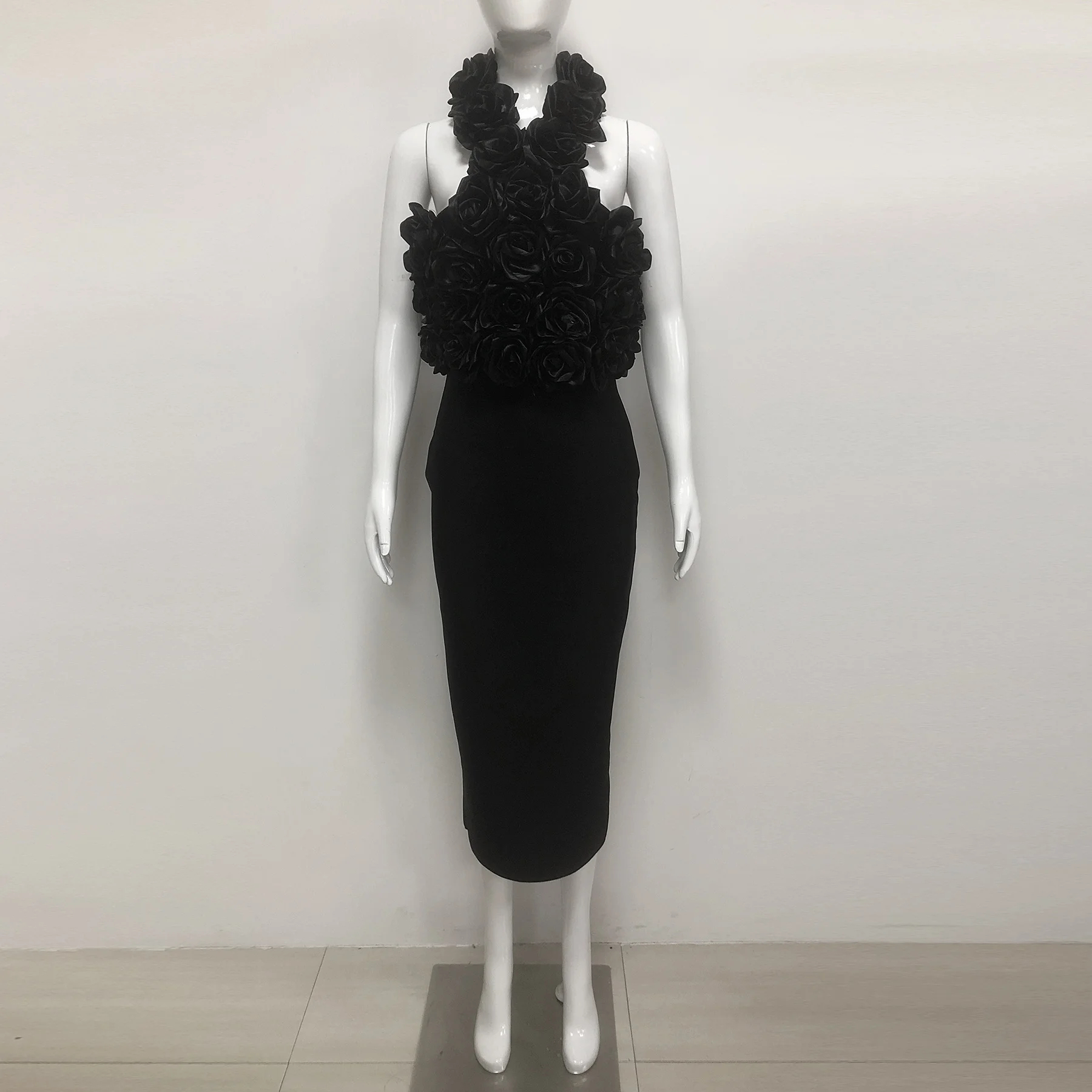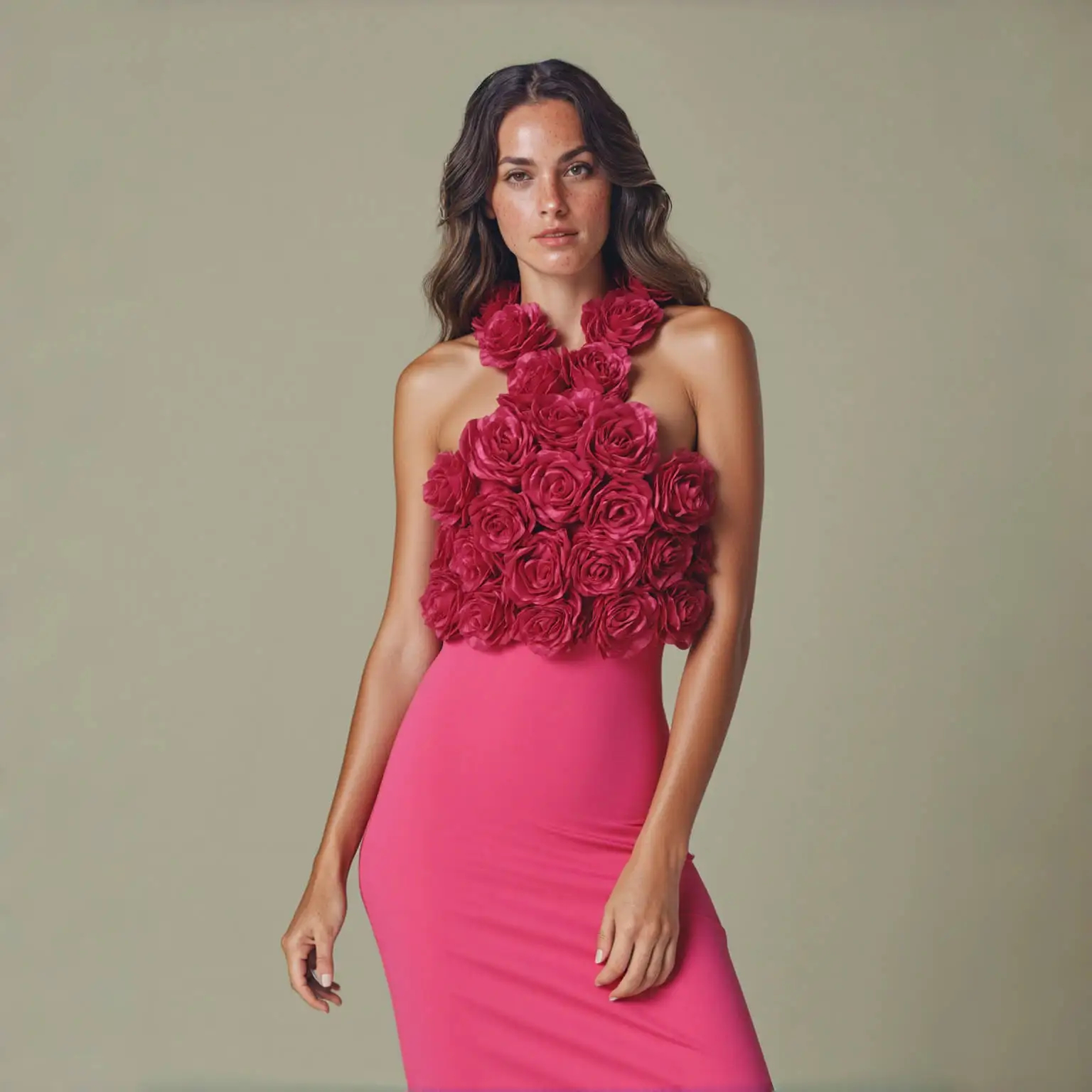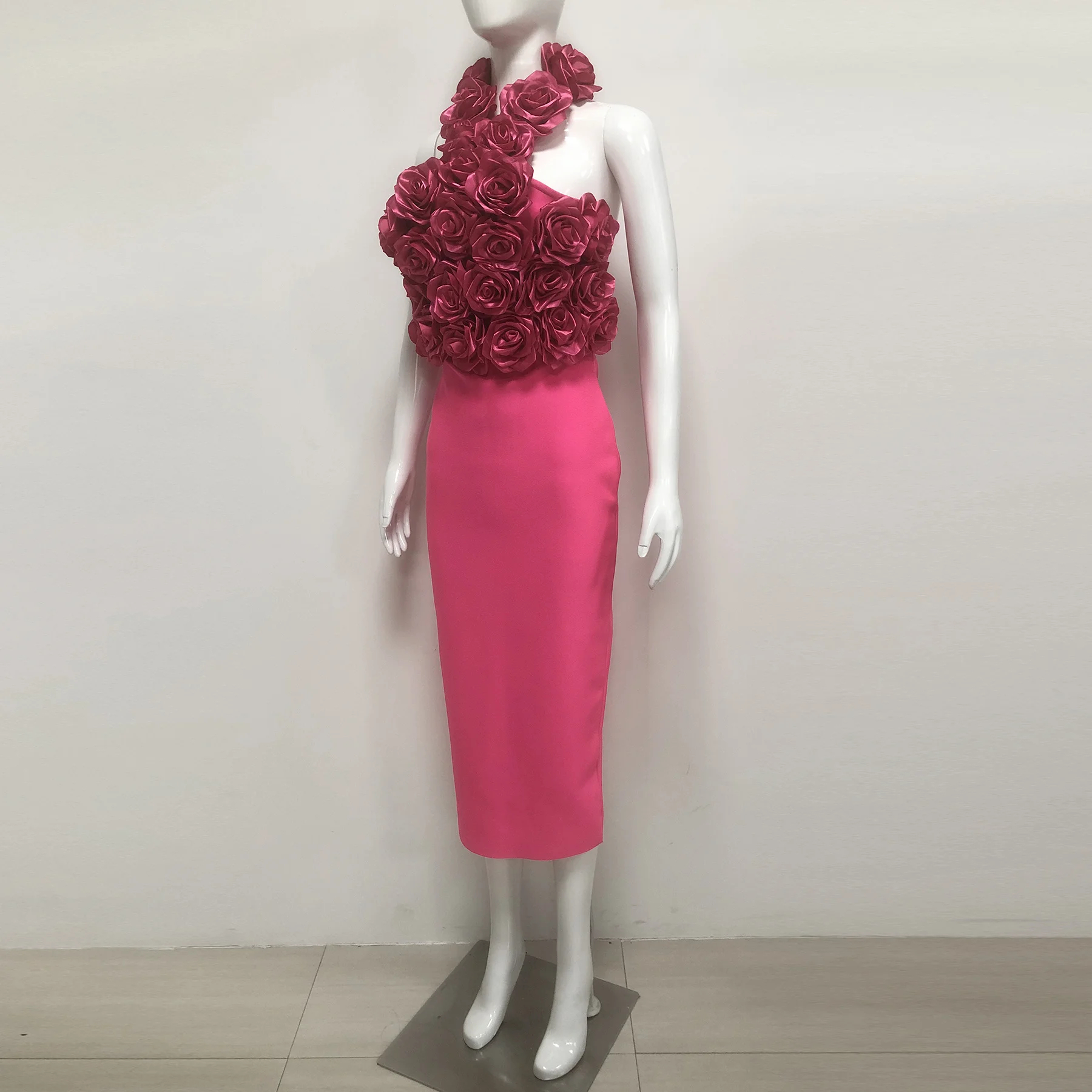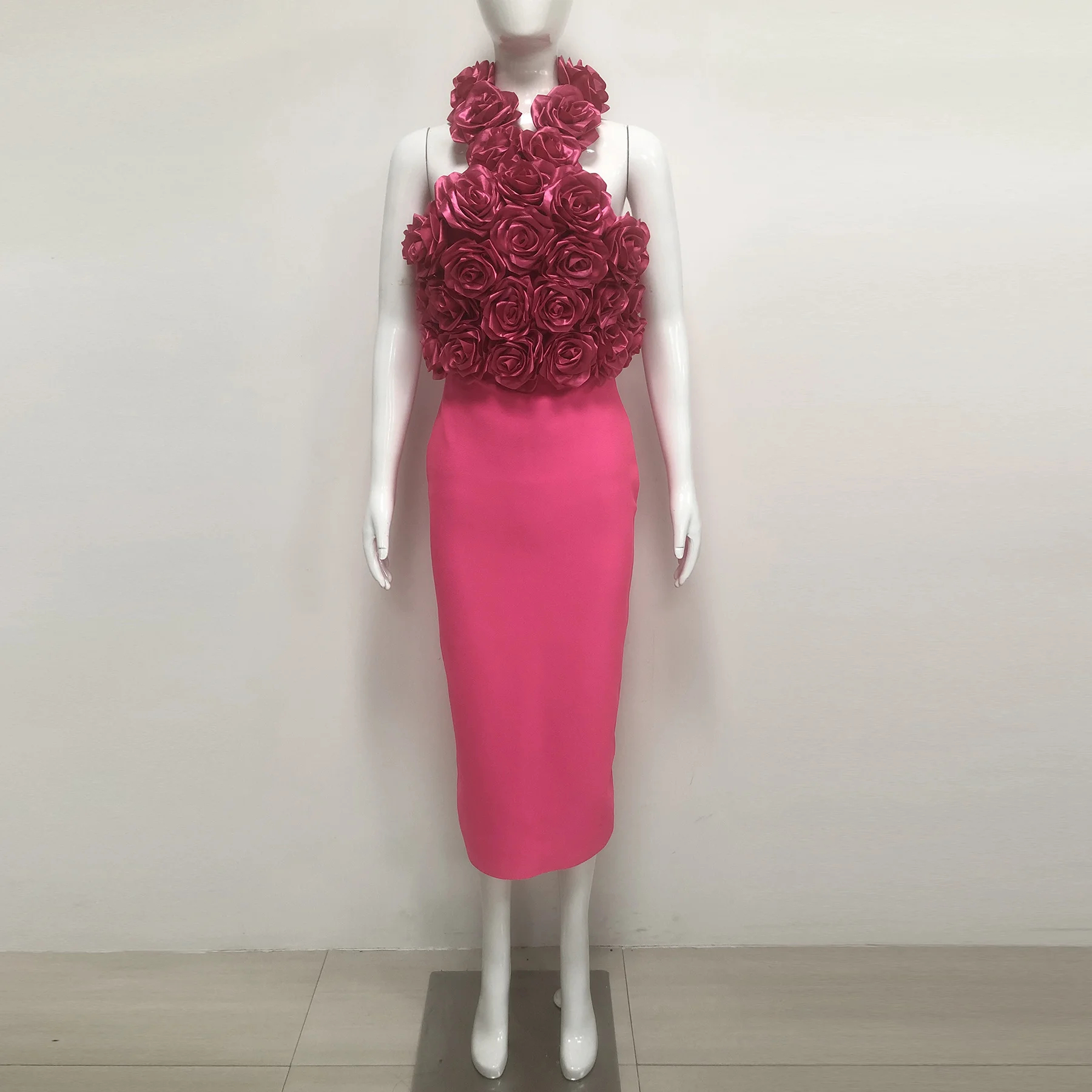 Hot Pink Rose Flower Midi Dress Mujeres Elegante Sin mangas Bodycon Vestido de noche Traje de fiesta de cóctel 3D Floral Ropa formal