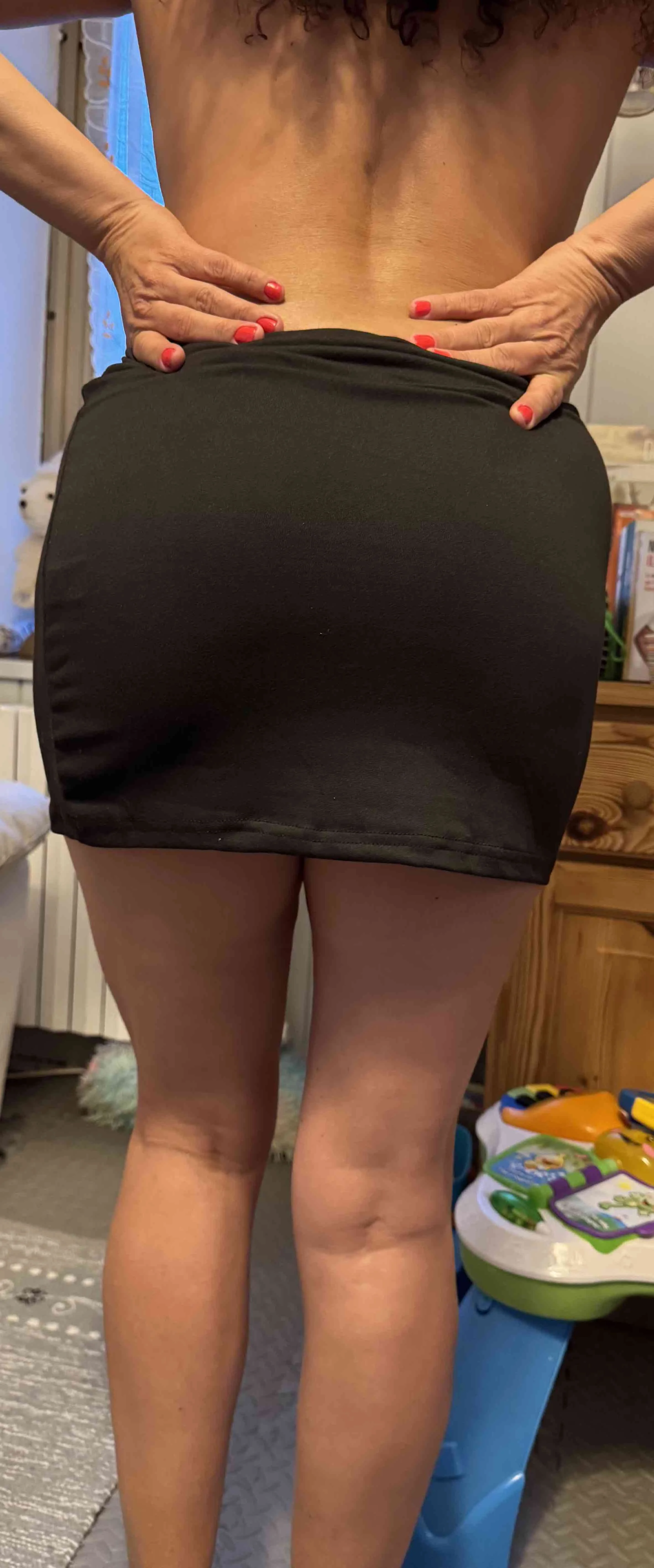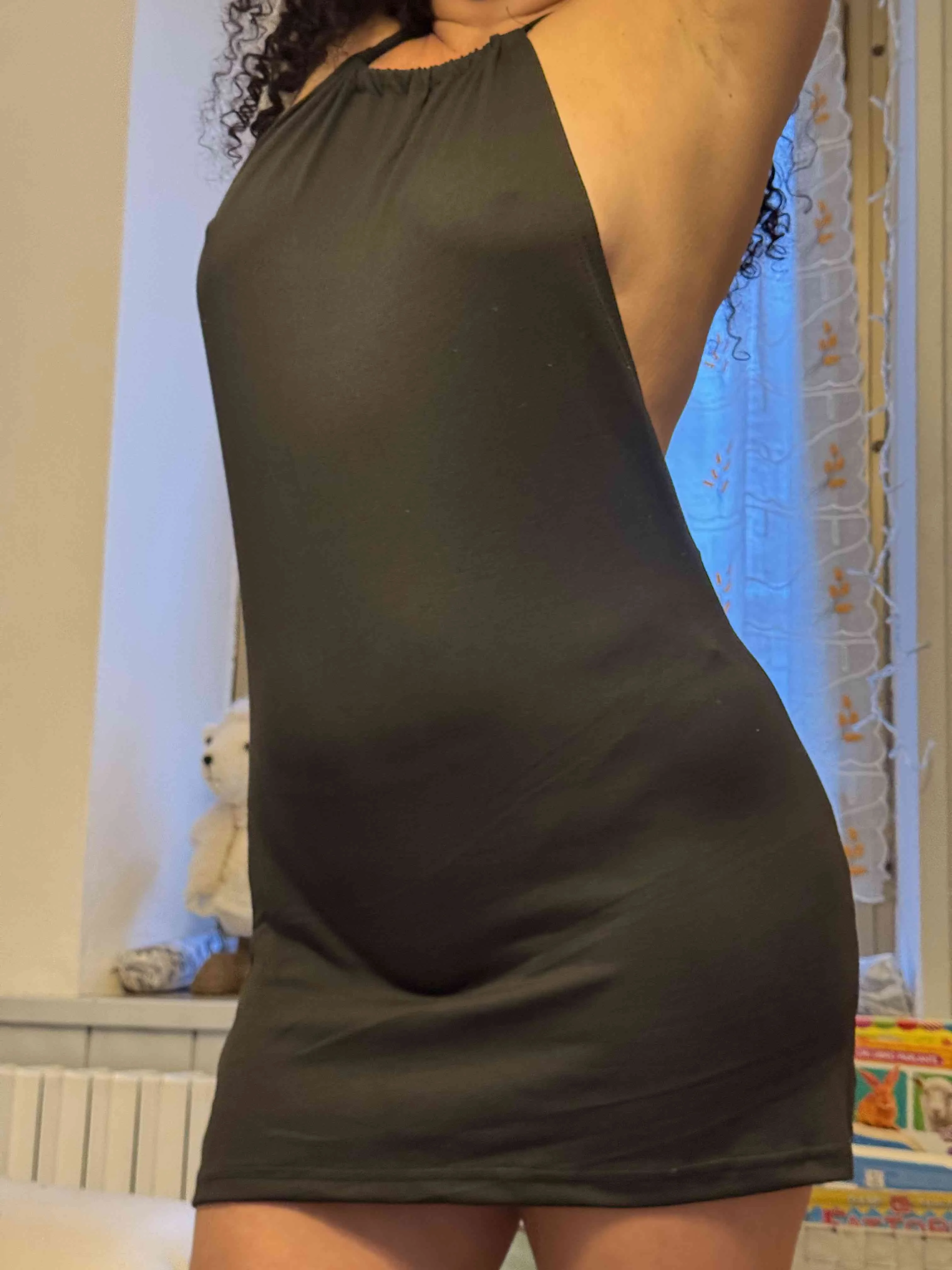 Precioso vestido, corto pero no demasiado corto. Tiene un cuello ajustable para poder tener una vista lateral de los senos.