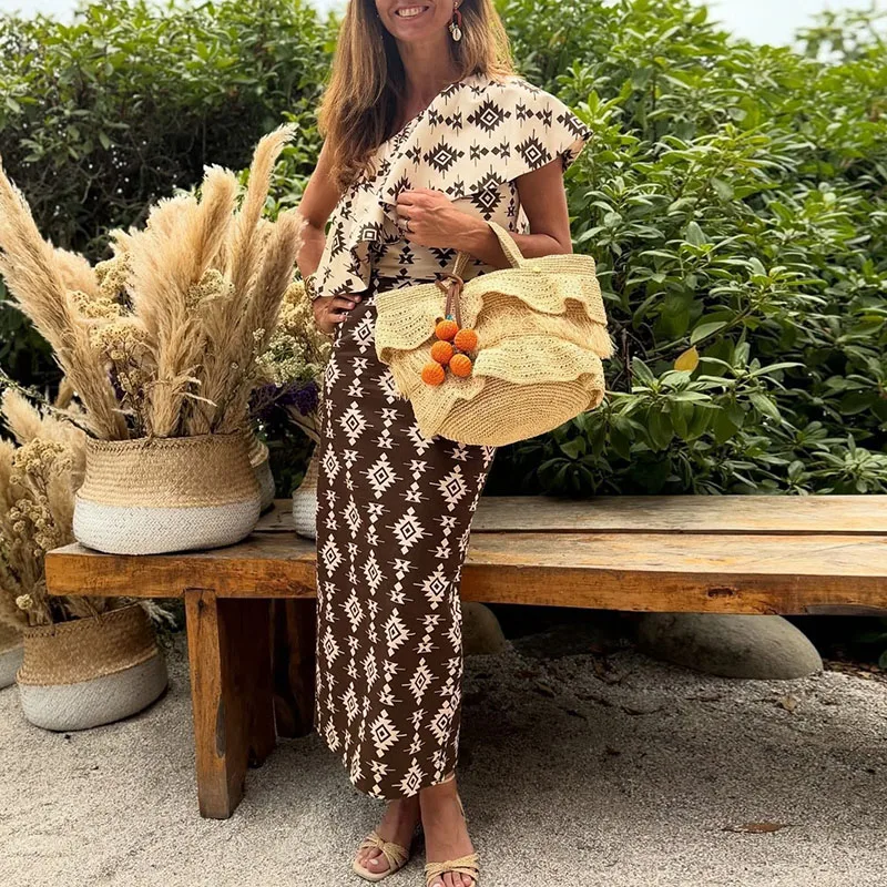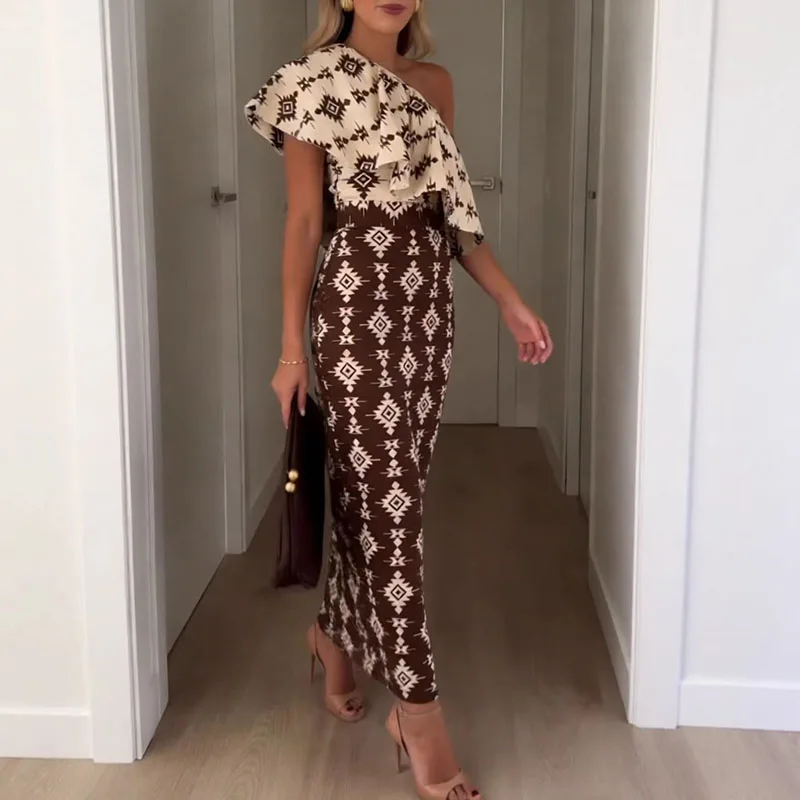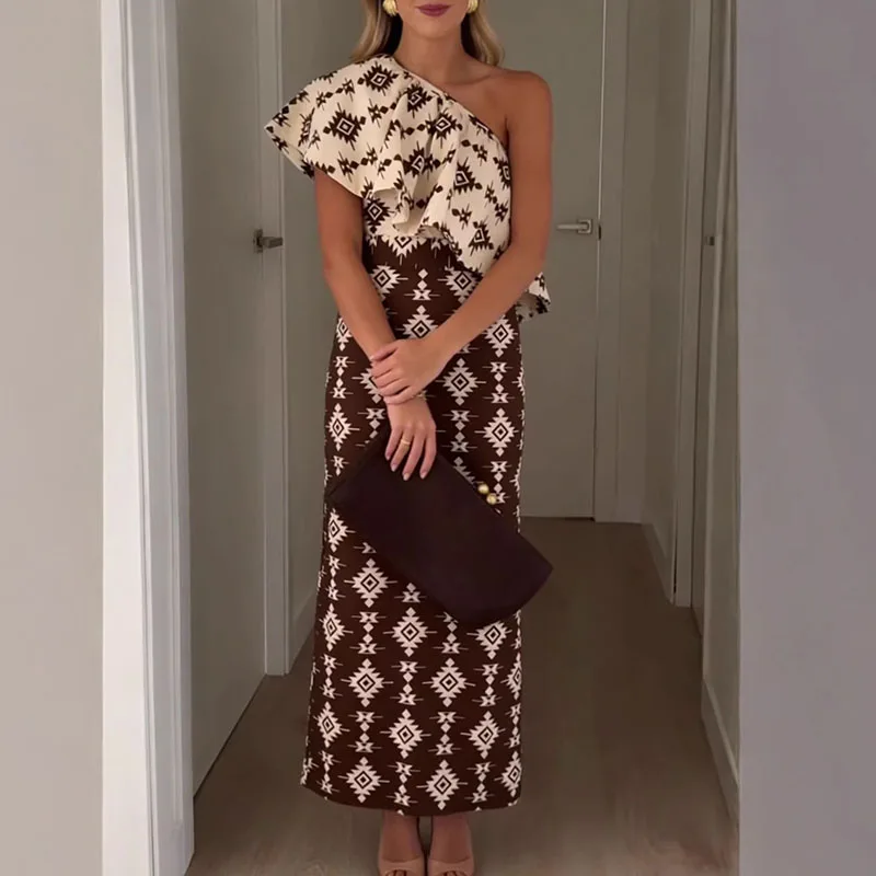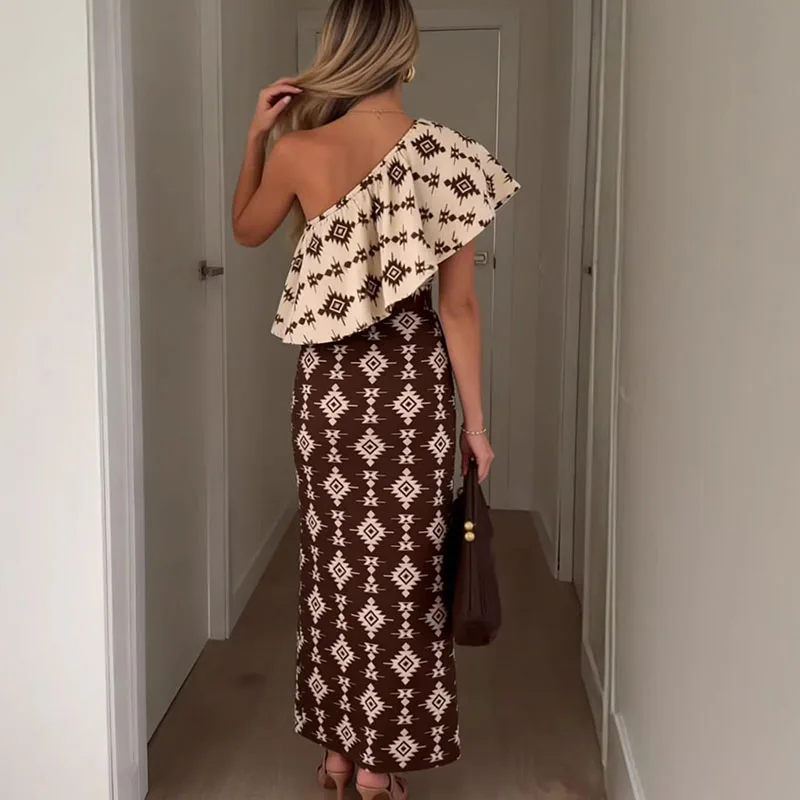 Vestido de Fiesta con Volantes, Estampado Vintage, Cuello en V,