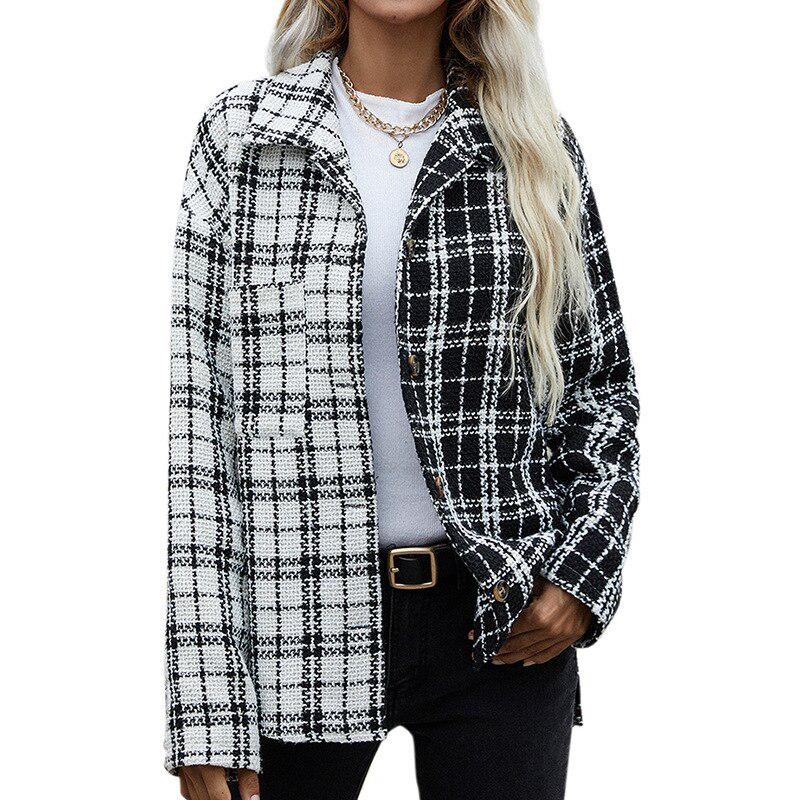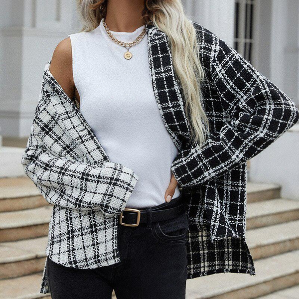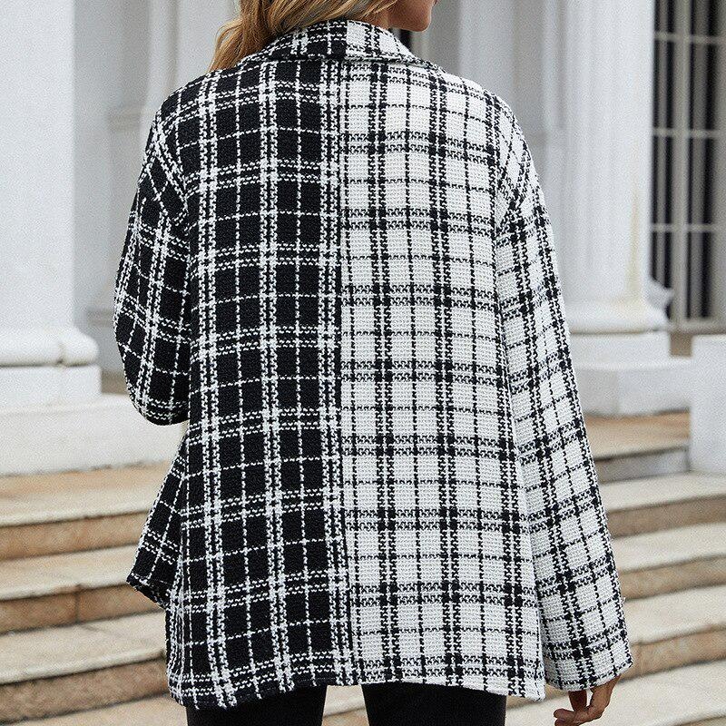Women's Jacket Autumn Black And White Stitching Cardigan Coat Plaid Clothes Жаночае восеньскае паліто